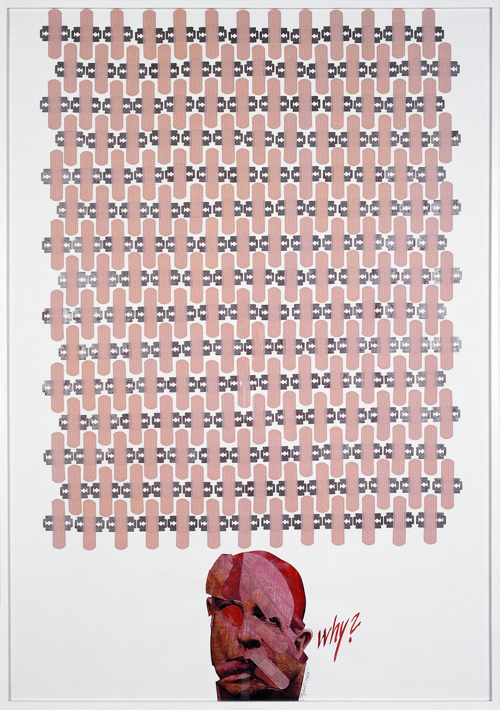 Za tokratno razstavo je narejen izbor cca. 40 fotokolažev iz različnih Jagodičevih obdobij in ciklov, skupna pa jim je anti-vojna tematika. Naslovi ciklov, iz katerih so izbrana dela, so že sami po sebi pomenjljivi: Way to a Bright future, Quo vadis Libertas?, Quo vadis Homo?, A walk Through 20th Century, A Walk Through 21st Century, Homo Animalis. Ironija, ki intonira omenjene naslove, je še bolj prisotna v naslovih posameznih del, čeprav jo že pogosto zamenjujeta neprizanesljiva bridkost in celo cinizem. V kreiranju naslovov ciklov in posameznih del se nam pokaže še ena ustvarjalna plat ustvarjalca – Jagodič je izjemno spreten tudi v uporabi jezika, zato ne preseneča, da ga poznamo tudi kot pisca, urednika in kolumnista.
