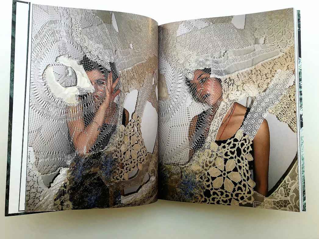 Eva Petrič’s Webbing is a »hybrid« of her visual art and creative writing with which she presents the web of her 25 art installations in the medium of lace assembage. Made in the period of 2012-2018, they were installed worldwide. Connected into one web by the artist’s perception of lace representing hematomas they seem to exist as a collective web which surpasses time and space. Hematomas occur not only when the wall of blood vessels is damaged and blood leaks into surrounding tisues where it does not belong, but also on emotional and social dimensions. We, as a society or as indiviudals, can ourselves be hematomas when emotional barriers break and emotions explode… Petrič’s hematomas, are further tied into one common web by their ephemerality: when the artist deinstalls them, they cease to exist and can never again appear in the same form – except in this monography.
