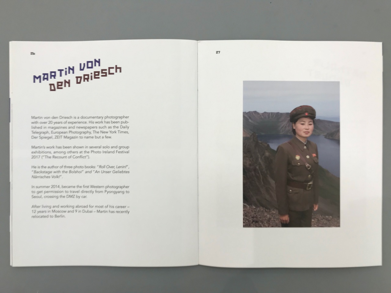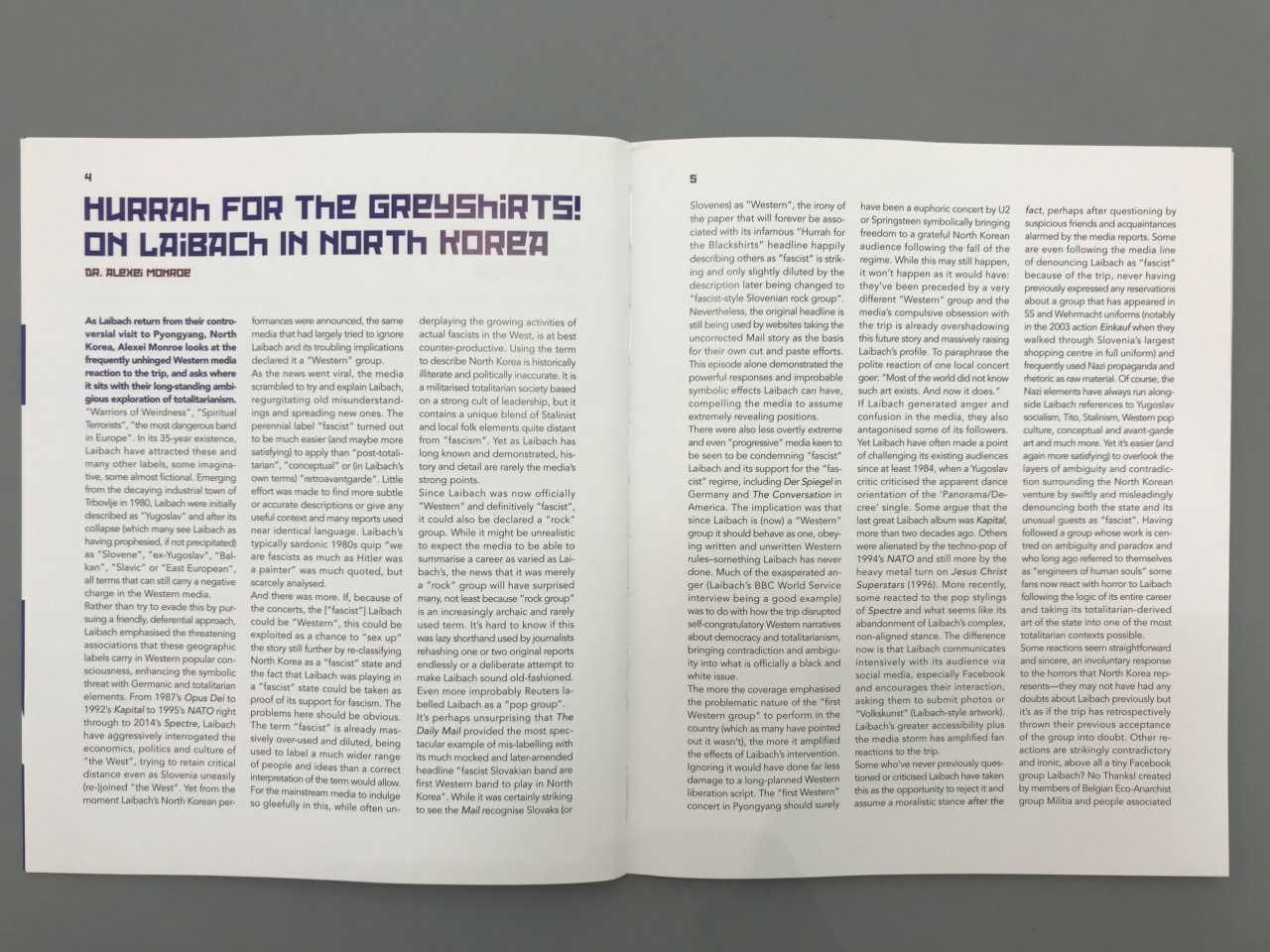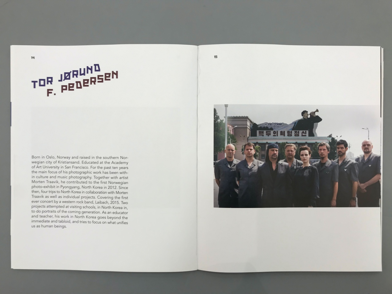 In August 2015, the musical group Laibach traveled to North Korea to perform at two consecutive concerts in Pyongyang as a part of the 70th anniversary of the liberation of the Korean Peninsula. A Norwegian film director, activist, and artist Morten Traavik made a documentary film on the groups’ visit entitled Liberation Day, which premiered at the beginning of 2017. Both the tour and the filming process produced a large number of additional photographs, of both documentary and artistic nature, a selection of which is presented in this catalogue.