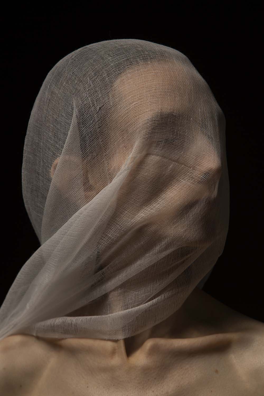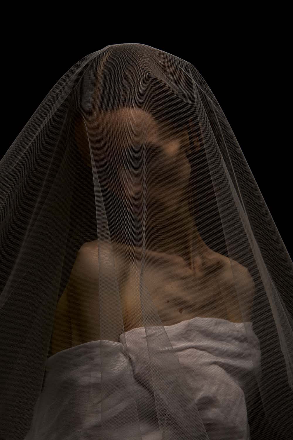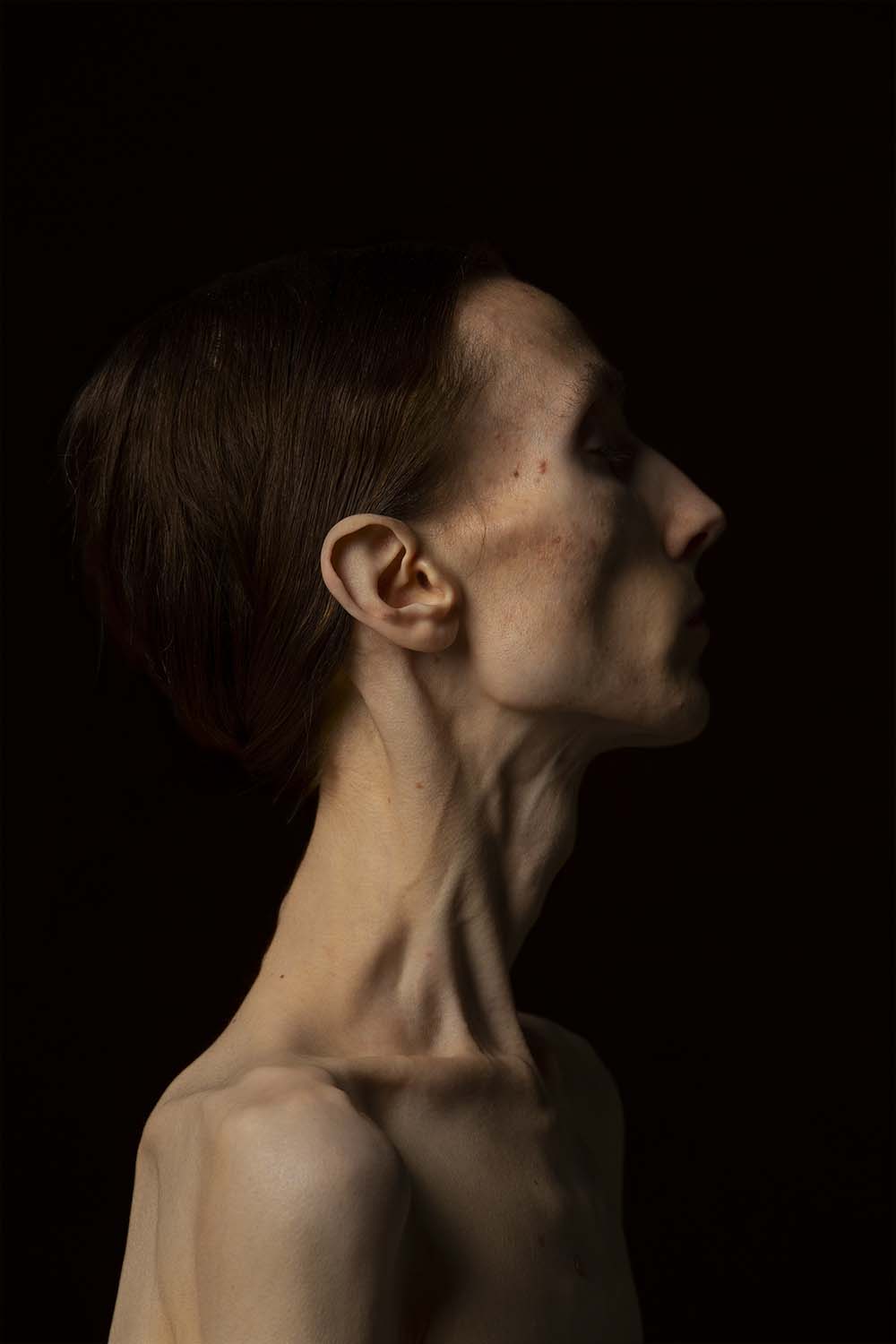 Bertok deals with the transience of the human body also in his latest series of works, this time, however, from a slightly different perspective. He introduces us to a tortured and exhausted, weary body, bearing the consequences of extreme physical and psychological experience of giving up food. Again, Bertok does not question the personal, psychological, or social motives and circumstances that brought the subject of his depiction into such a state. The artist compares the experience of anorexia with other borderline experiences, be it the so-called SM practices or the survival in the extreme conditions of concentration camps, which he has dealt with in his former projects and photographic series. Thus, the purpose of the project is not to “photodocument” the phenomenon of a disorder or disease, but rather to question the very nature of our physicality, our relationship to the emaciated body and the pain that we presuppose or feel when looking at the proximity of death.