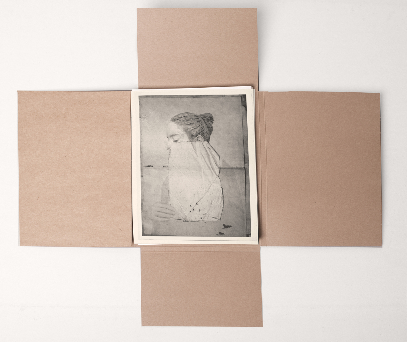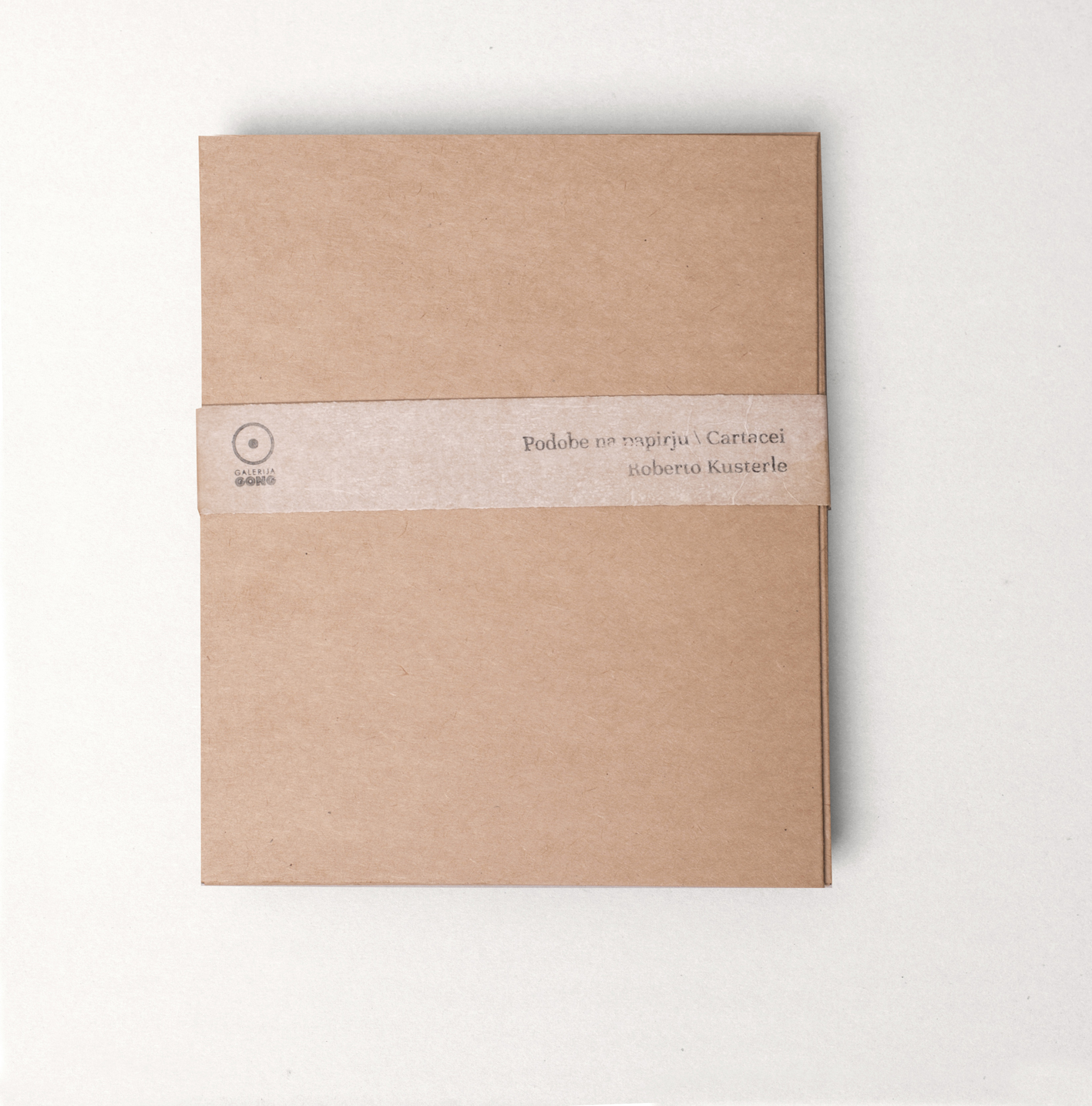 Robert Kusterle’s exhibition catalogue is actually a photographic folder published on the occasion of the Images on Paper / Cartacei, exhibition opening at the Gong Gallery in Nova Gorica. The conceptual design of the publication is a collaboration between the artist, Gong Gallery and Studio Faganel from Gorizia, where the catalogue was also designed. The photographic folder includes, in addition to the expert text, fourteen individual reproductions of photographs based on images of old papers from the Gorizia archive, with damaged and faded stamps layered on top of each other. The last layer is made up of human figures that merge and are immersed in the paper, so that the viewer can no longer distinguish between the surface of the body and the paper. In the context of the artist’s concept of photographs, the cover of the folder is partly made of pieces of old paper, while the title of the exhibition and the gallery’s logo are stamped onto it.