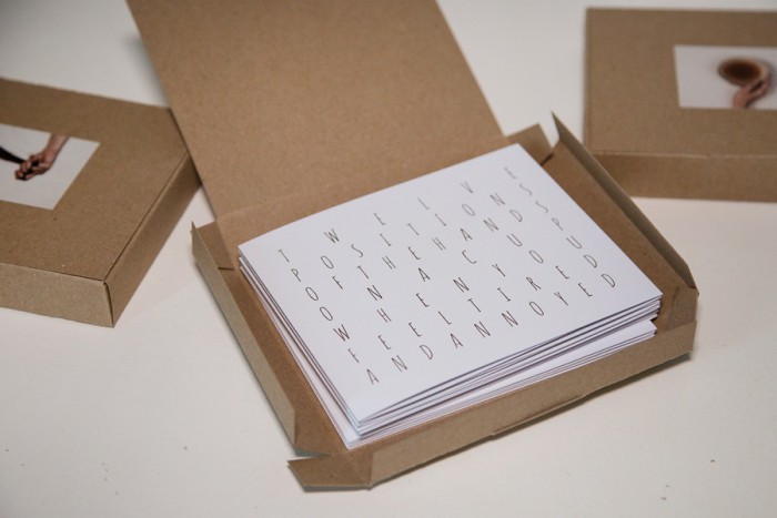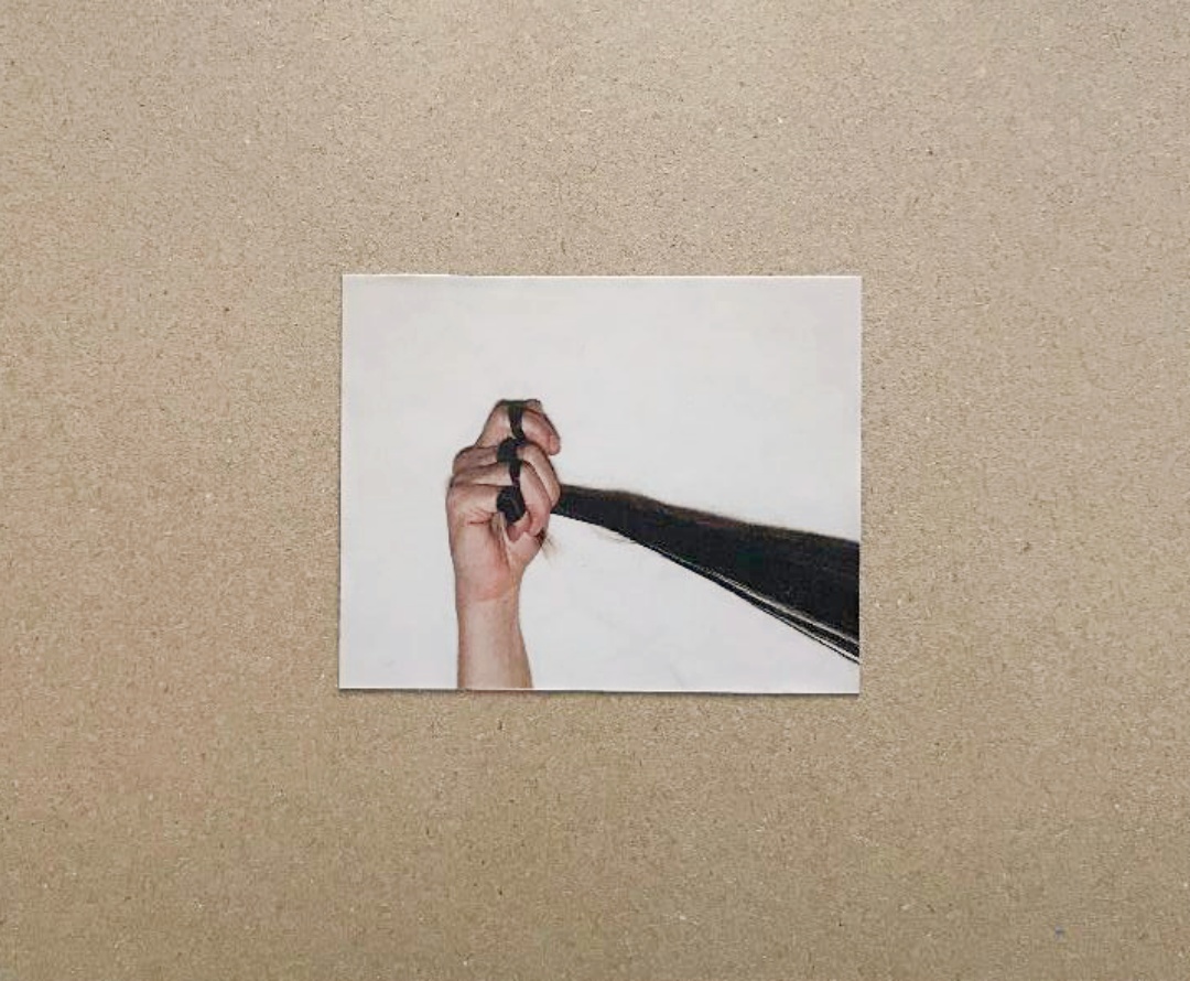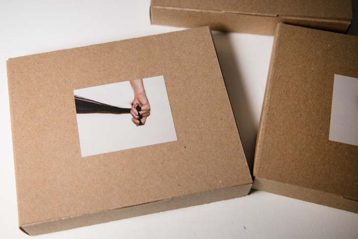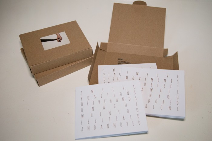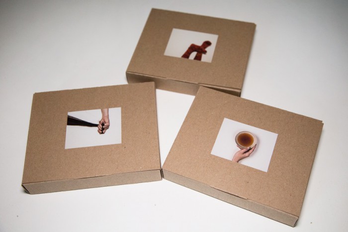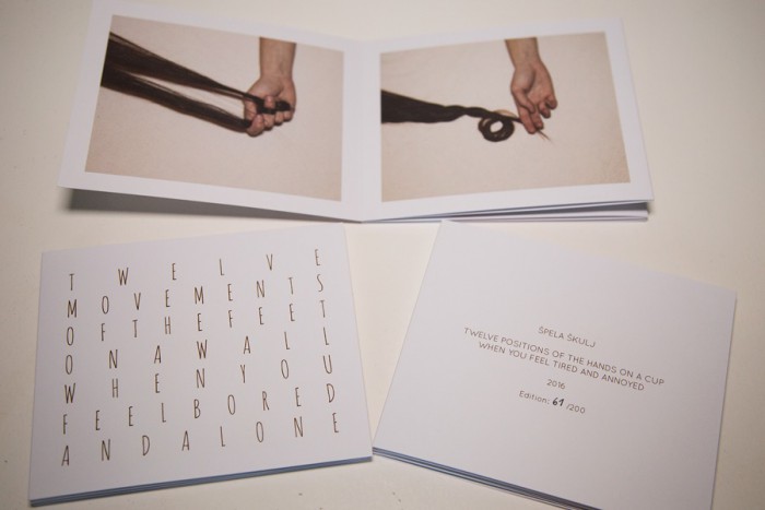The photo book consists of three leaflets in a homemade cardboard box. There are three different covers with three different stickers. Each leaflet contains one of the series from the triptych Movements: Twelve positions of the hands on a cup of tea when you feel tired and annoyed, Twelve movements of the feet on a wall when you feel bored and alone and Twelve placements of the fingers on a lock of hair when you feel small and unsure.